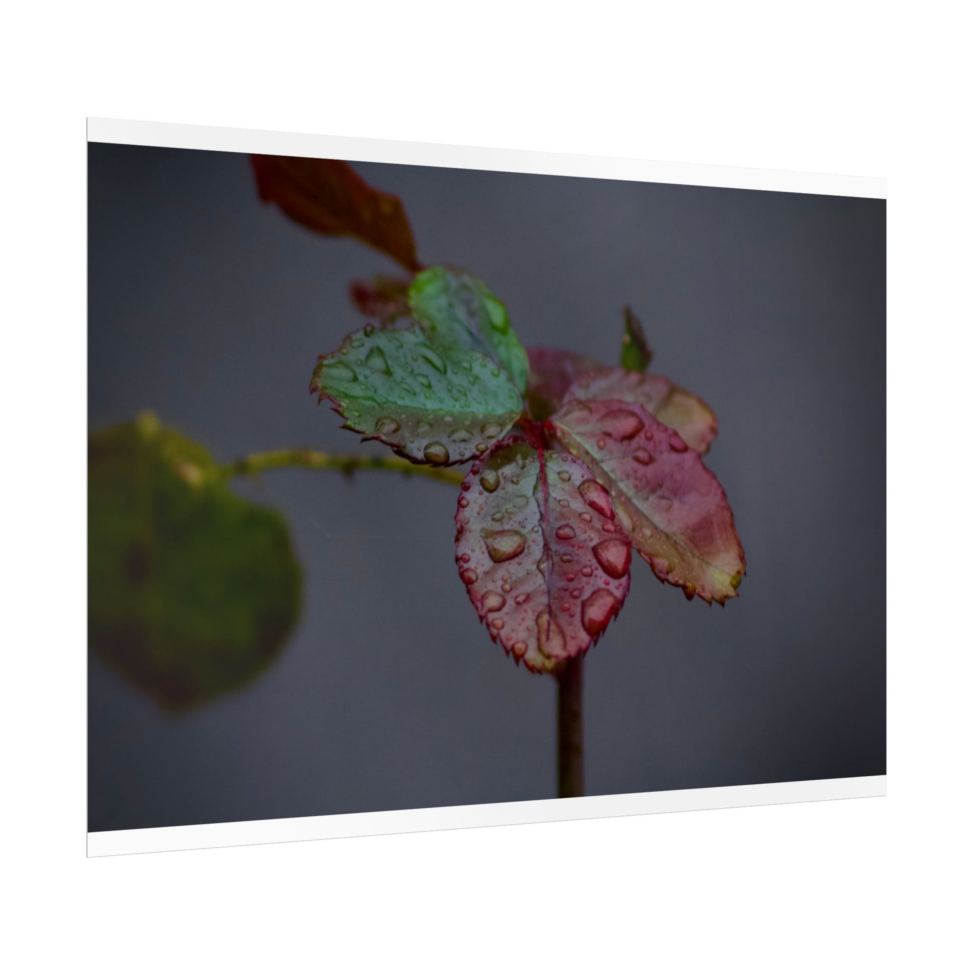 A quiet study of a single rose leaf after rain — soft textures, jewel-toned greens and reds, and pearled water droplets captured with delicate clarity. Printed using archival Giclée processes, this rolled poster brings a moody, intimate moment of nature into a living room, studio, or hallway. Choose from fine art textured paper for a painterly, tactile presence; semi-glossy photo paper for punchy color or matte paper for a softer, museum-style finish. Available in horizontal formats and multiple sizes to fit compact nooks or framed statement walls.